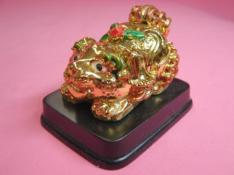 The feng shui dog is approx. 3" in length, and 3" in width. It is made of resin.