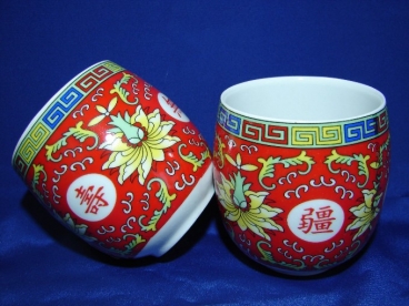 This red tea set is made of porcelain. The teapot is approx. 5" in diameter and 4.5" in height, serving approx. 700 ml water. Each cup is approx. 2.5" in width and 3" in height