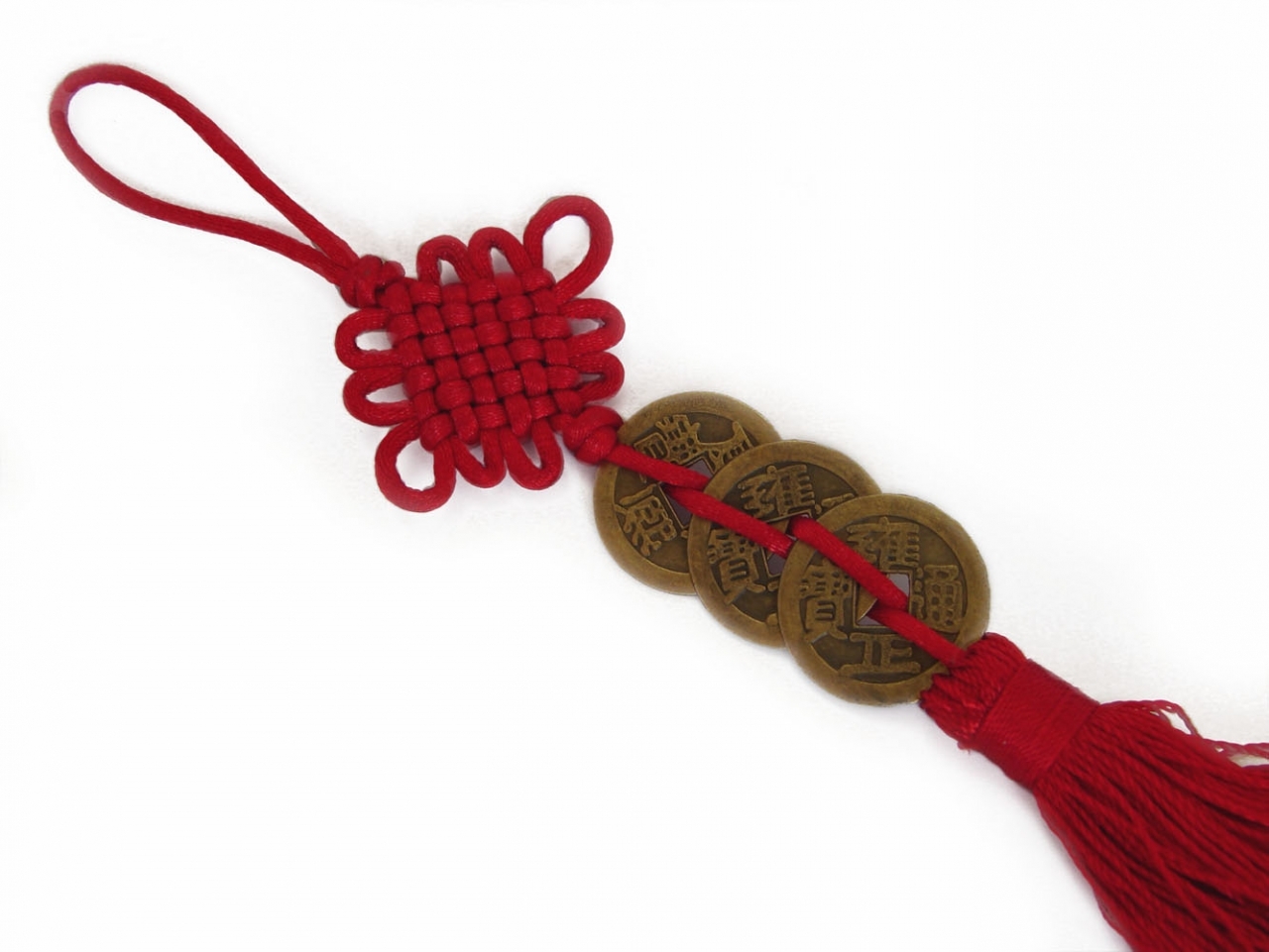 This lucky coin charm has 3 thick artificial Qing dynasty emperor coins with red tassel and mystic knot. Hanging such money charm at home can bring money luck.