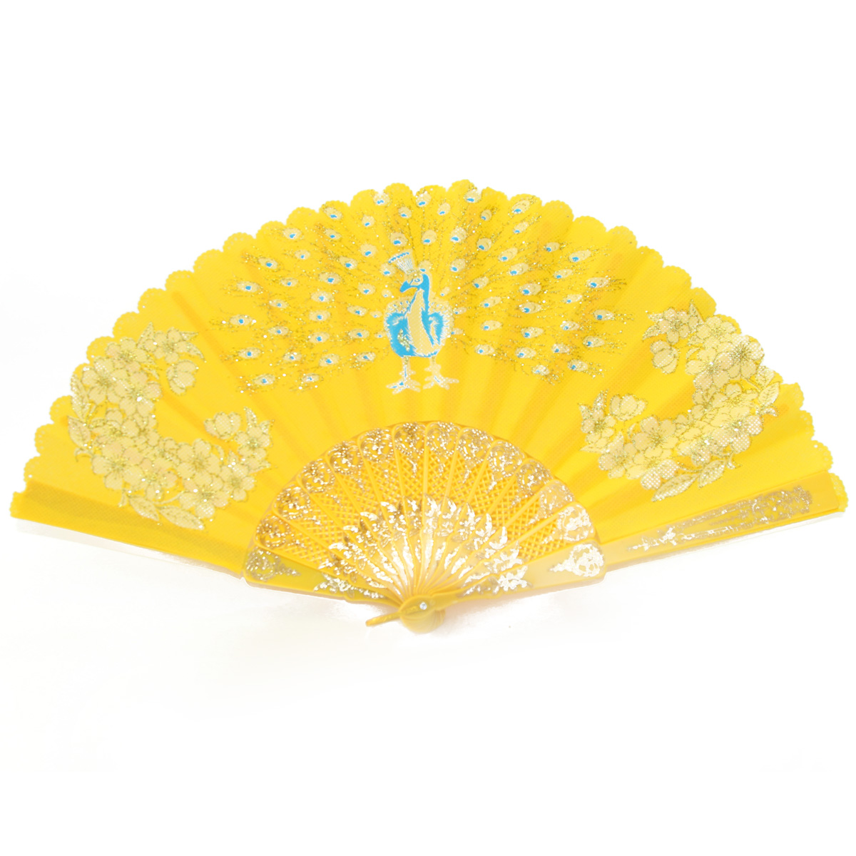 These beautifully crafted and detailed hand fans features a delicate peacock, golden flower designs, and cherry blossom borders. These gorgeous fans are great for use, display, or a gift for friends and family. The colors vary from red, pink, yellow, purple, blue to green. With its powerfully captivating plumage, vibrant colorings, and gorgeous tail feathers, the peacock is widely known as the earthly manifestation of the legendary Phoenix. With its beauty and grace, the peacock symbolizes eternal love, beauty, purity, royalty, and faith.