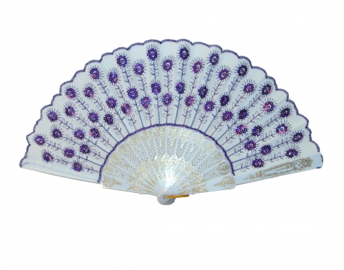 These beautiful decorative peacock style hand fans embroidered with sequins are great to keep in hand for cooling. The colors are various from black, red, purple, green, blue and pink. Each of the hand fans is approx. 9.5" in length. The price is for one hand fan.