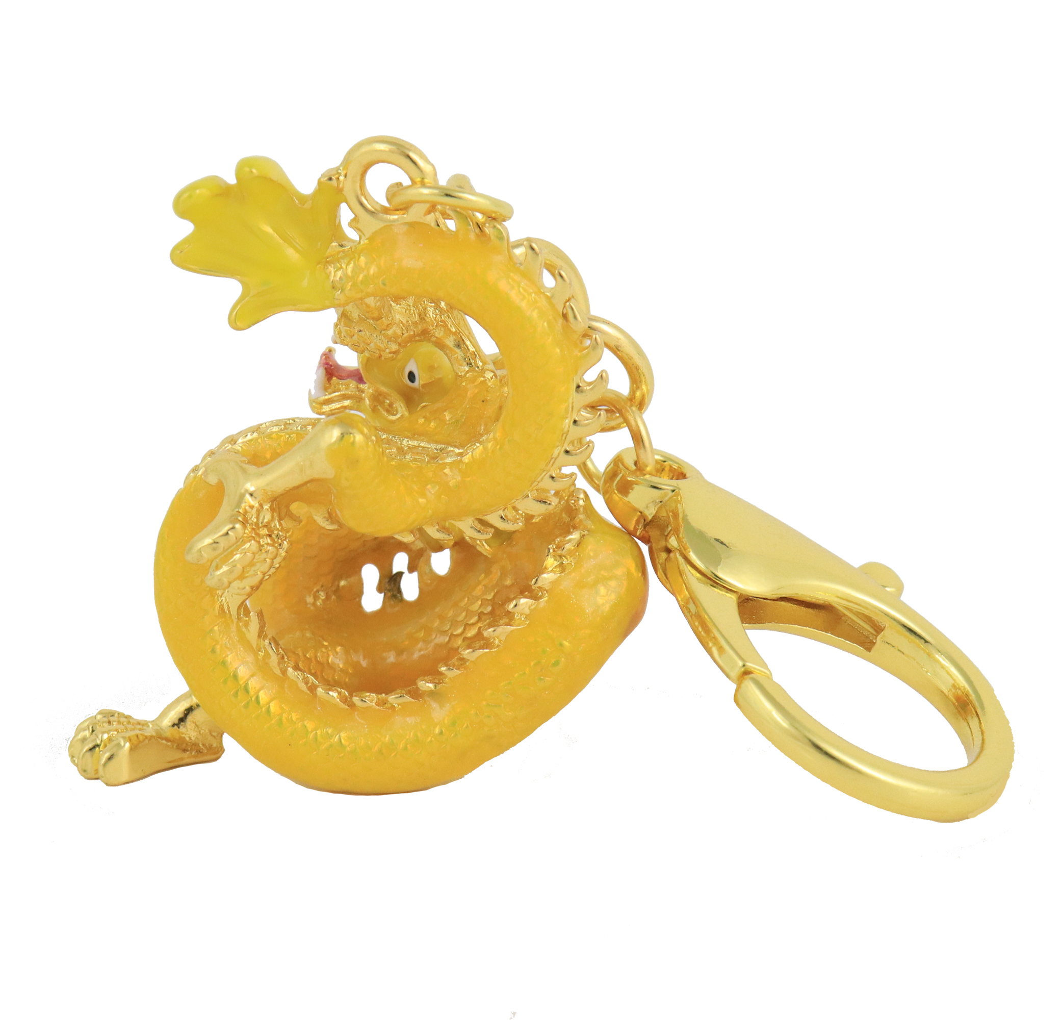 The dimension of the Rising Golden Dragon amulet itself is approx. 1.5"x 1.25"x 2". The whole length of the Rising Golden Dragon keychain is approx. 4.5". It is made of metal.