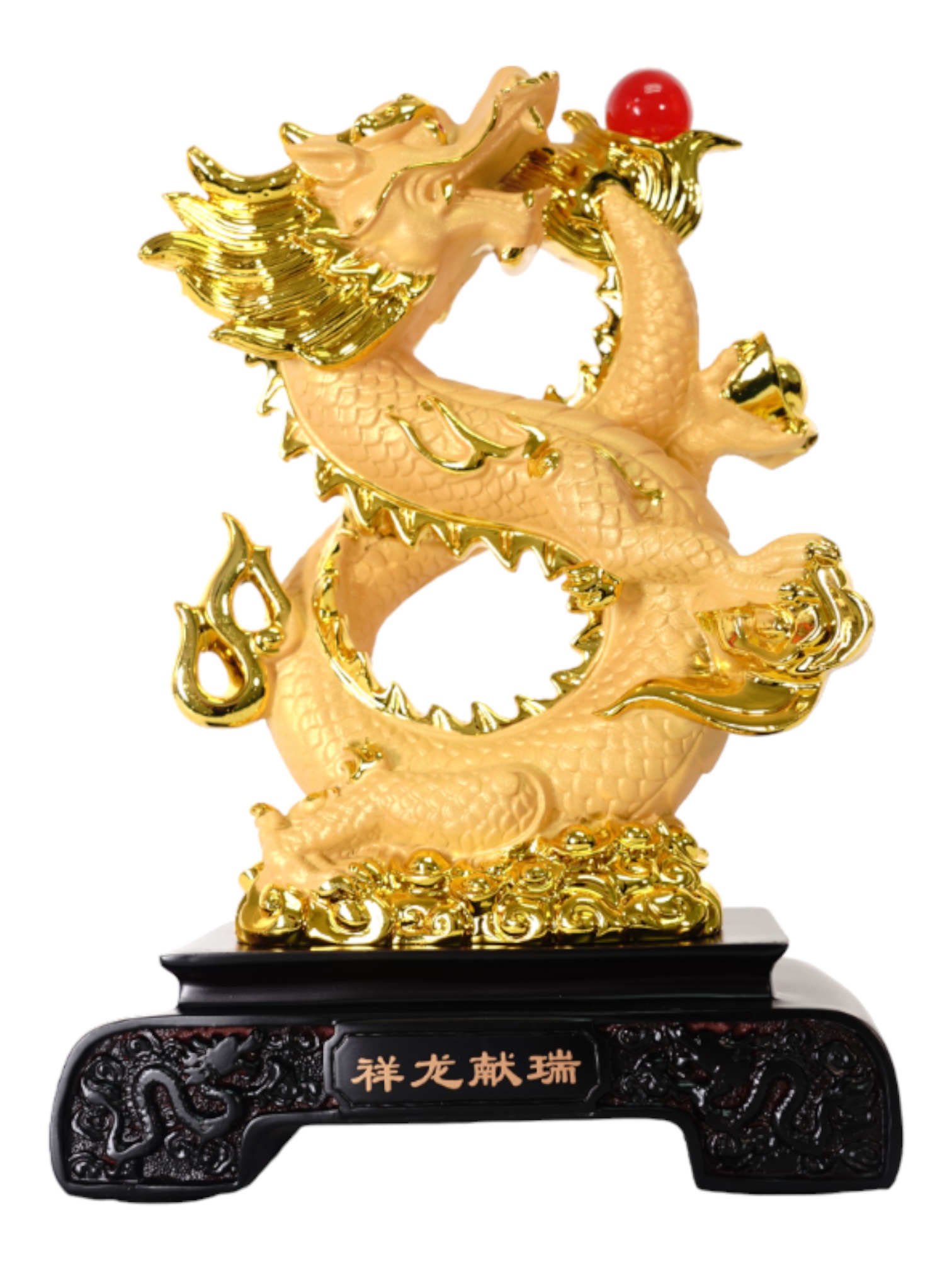 This gorgeous standing up Chinese golden dragon statue looks like a number 8 which stands for wealth and prosperity. The red ball and Chinese coins symbolize the treasure. They enhance the power of the wealth energy which is believed to bring by the dragon. Displaying this magnificent Feng Shui dragon statue in your house will tremendously make your house full of vitality and thus protect your family from harm. It is good for the year of the dragon 2024.
