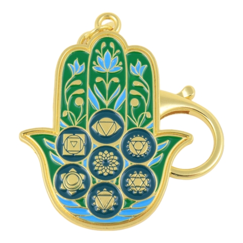 The dimension of the feng shui Hamsa Hand Life Force amulet itself is approx. 2.25" x 1.8" x 0.125". The overall length of this feng shui Hamsa Hand Life Force keychain is approx. 5". It is made of metal.