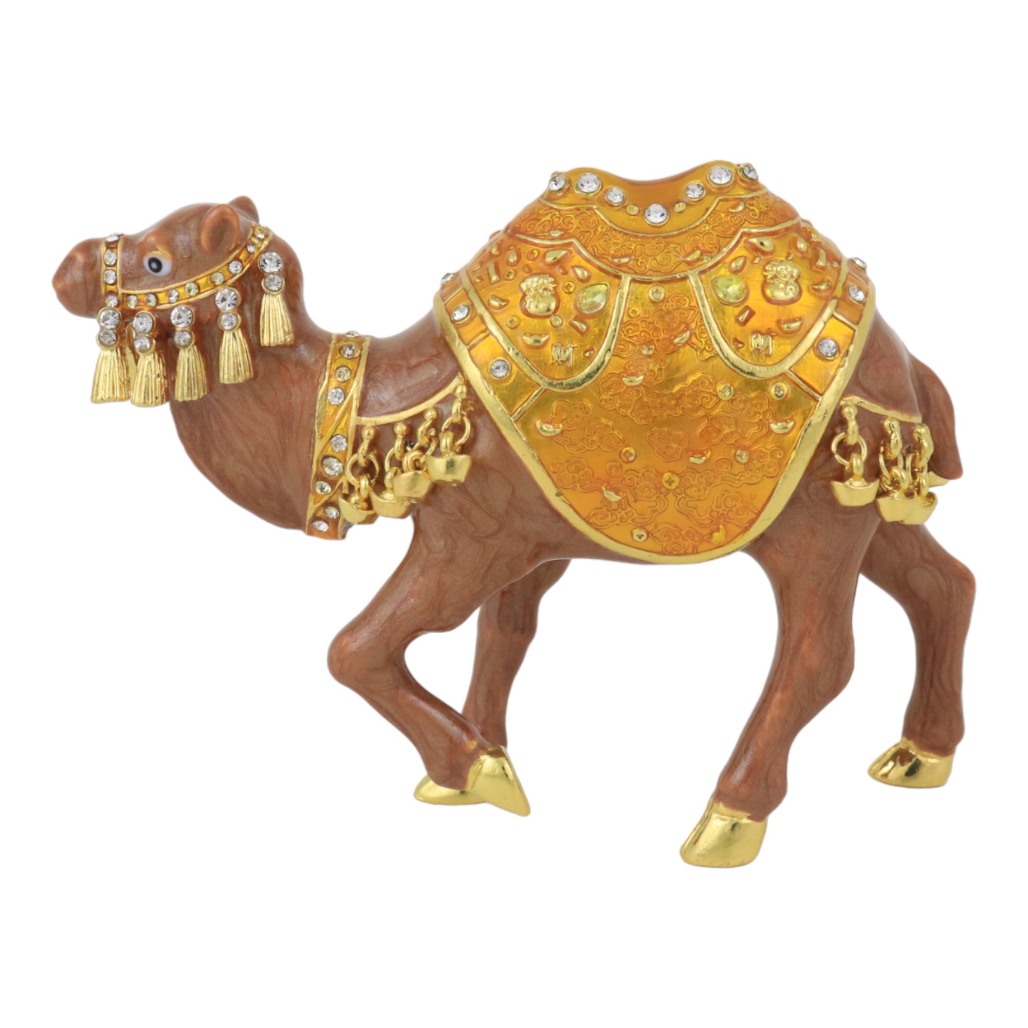 You can display this bejeweled camel on your desk. The dimension of Cash Flow Camel is approx. 4.5"(L) x 1.75"(W) x 3.75"(H). It is made of metal.