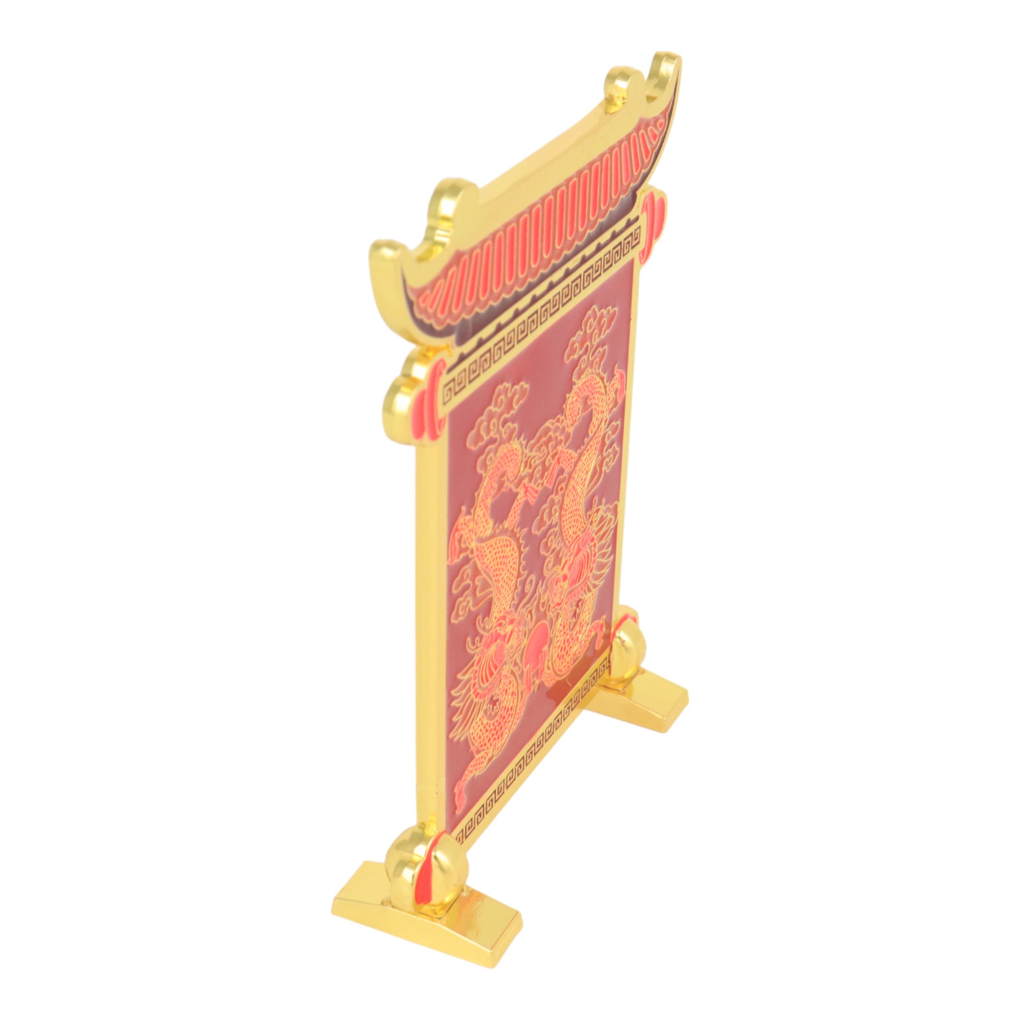The dimension of the feng shui double dragon Yang energy plaque is approx. 3.125" x 1.1" x 4.5". It is made of metal.