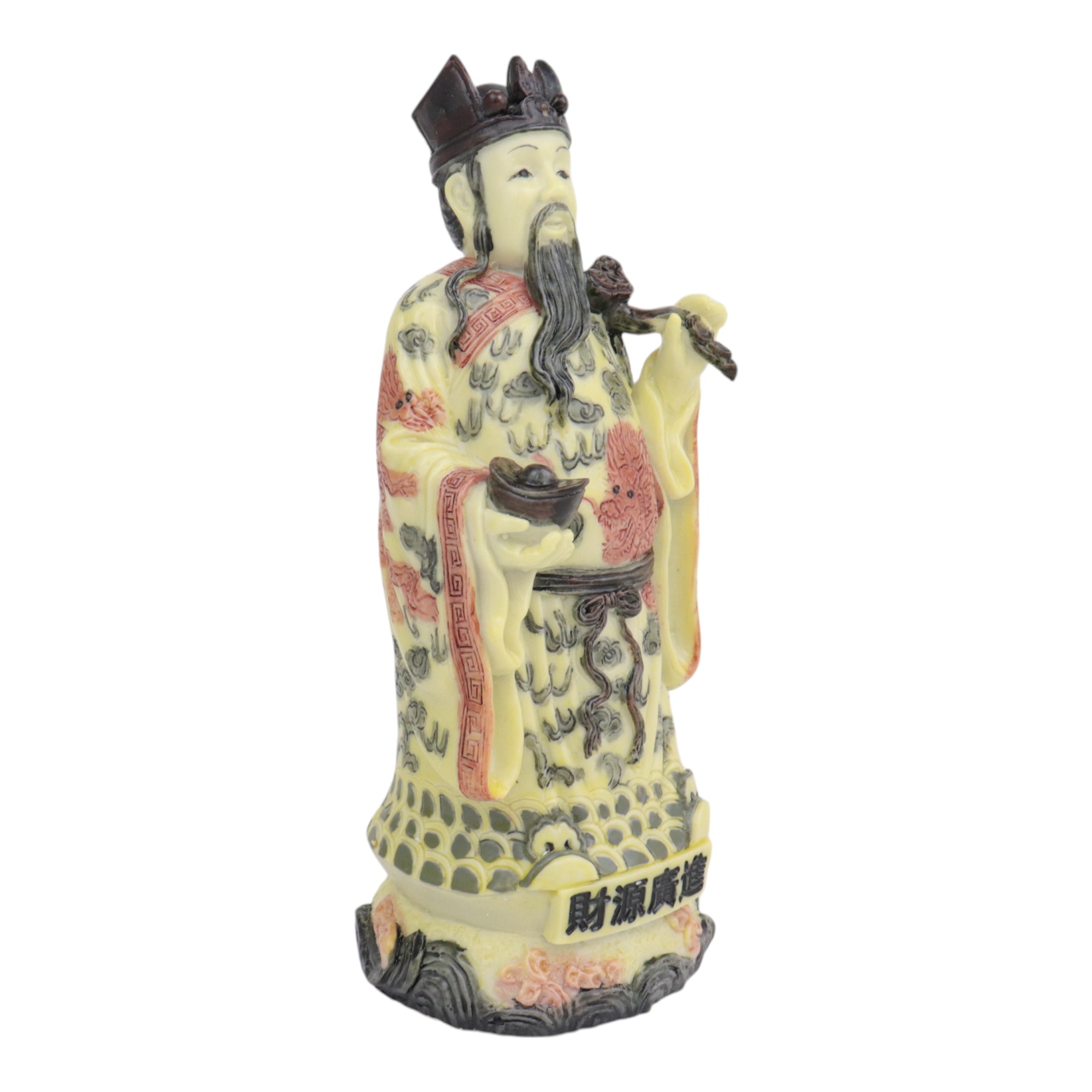 The dimension of the God of Wealth is approx. 3"(L) x 2.8"(D) x 7.5"(H). It is made of resin.
