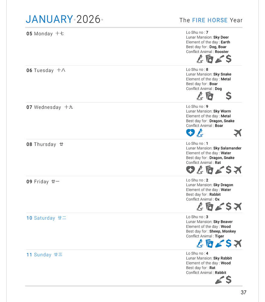 The Year of the Fire Horse is ruled by Yang Fire (branch) and Yang Fire (stem), so it is crucial to plan ahead and take note of the days that are auspicious for specific activities, and days that are not in order to make the most of the year. Lillian Too's Feng Shui Diary features the Hundred Year calendar, Personal Direction tables, Period 9 & Period charts, Kua numbers, 24 Mountains, 8 Aspirations, Astrology Affinities and Combinations, Formulation of Trigrams, Lo Shu and Ho Tu squares, and many more useful resource tables invaluable to any practitioner of feng shui. Lots of space also to write in, to use as your planner for the year, or to make a record of how the year unfolds for you.