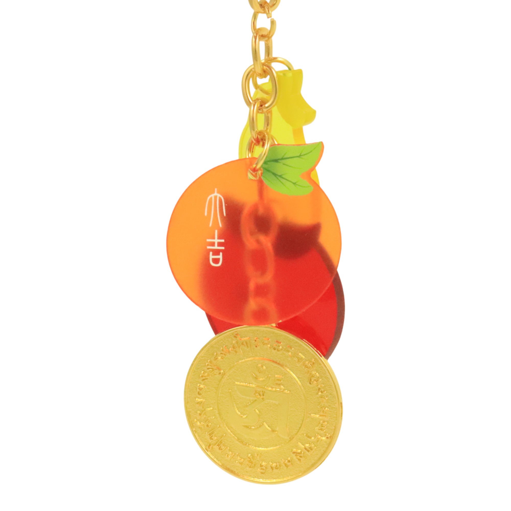 The dimension of Tai Kat Tai Ley Apple Enhancer Amulet keychain is 5" x 1.3" x 0.1". The tri-fruits are made of plastic and the anti-conflict amulet is made of alloy.