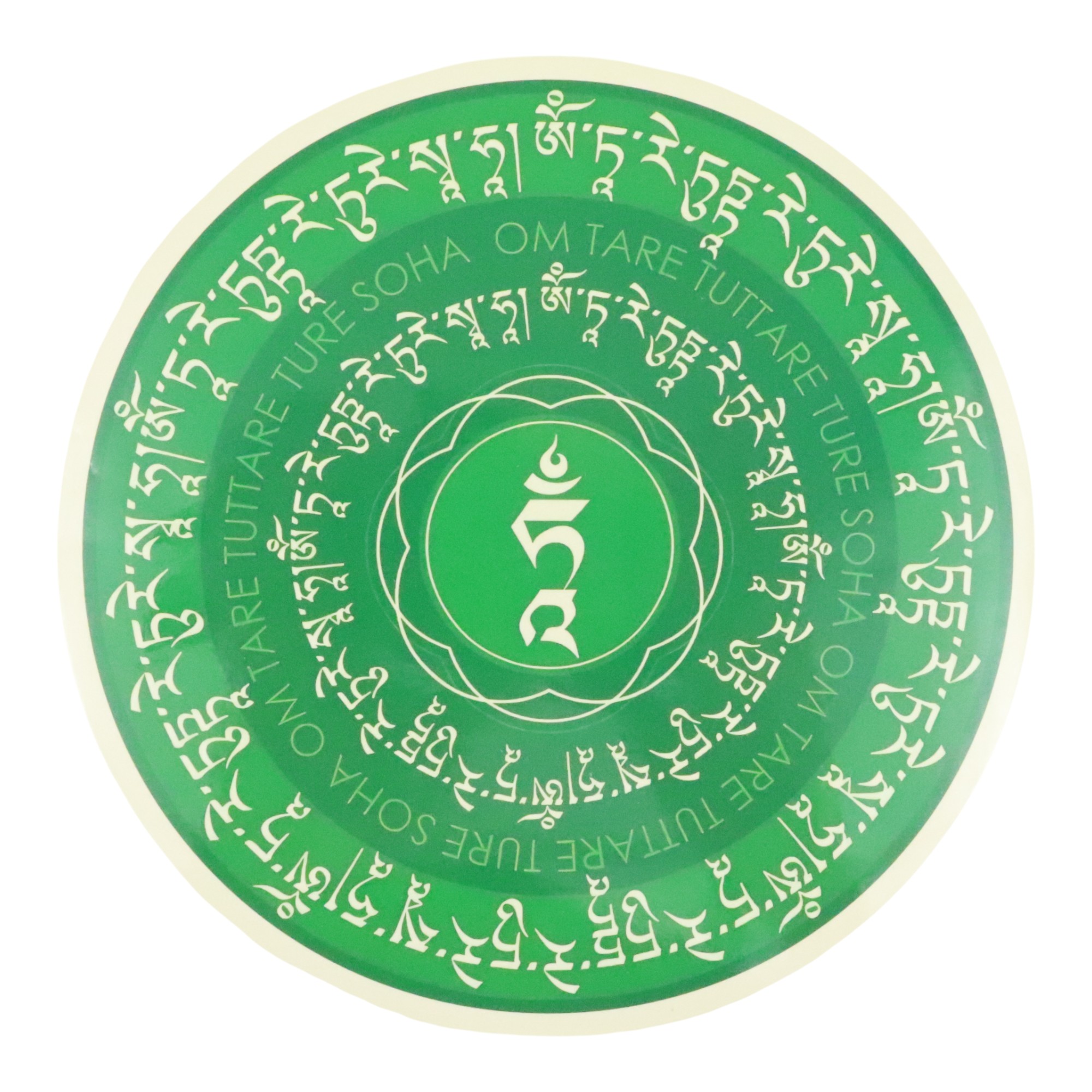 This feng shui window sticker features Green Tara's sacred mantra "OM Tare Tuttare Ture Soha" to overcome obstacles and dissolve all kinds of problems.