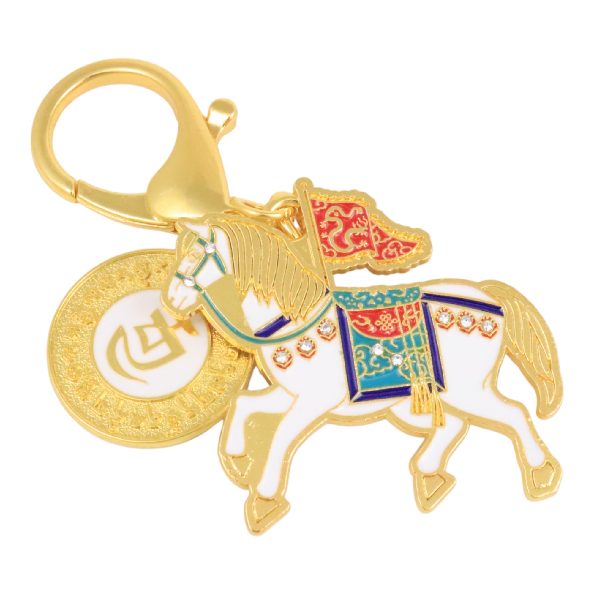 Carrying the victory flag adorned with dragon emblem, this white victory horse stands for sign of victory, recognition and triumph.