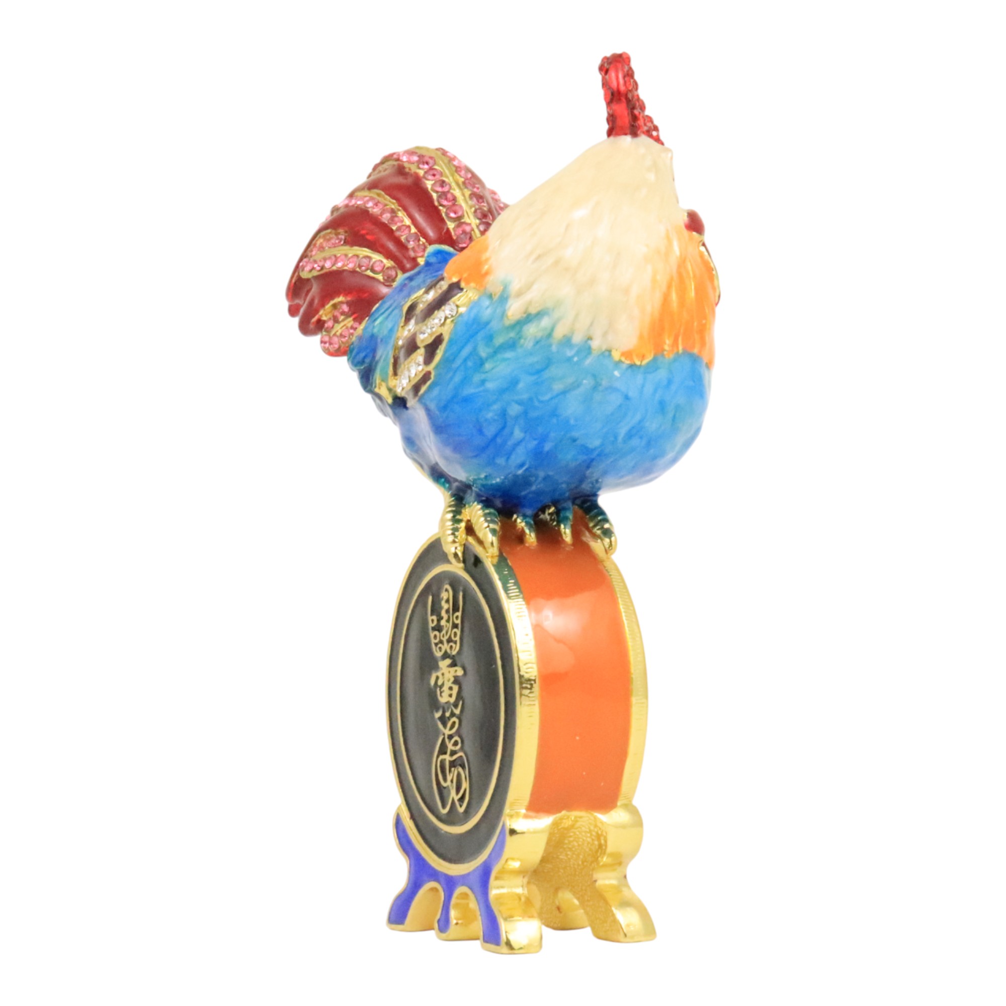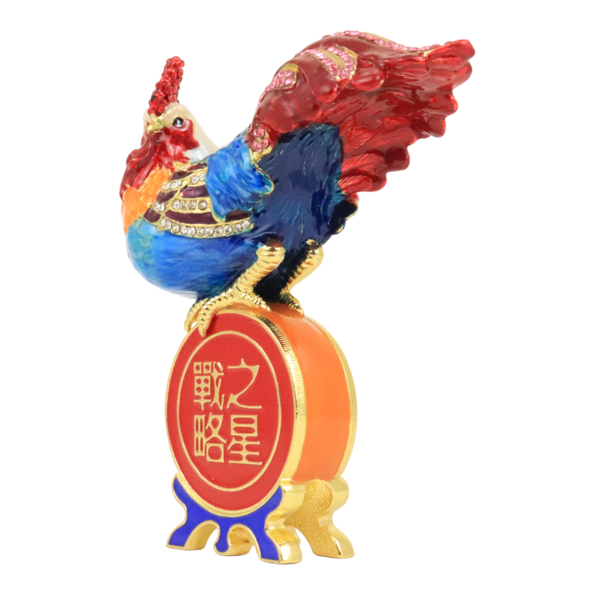 The dimension of the feng shui Rooster is approx. 4.5" x 1.8" x 5". It is made of metal.