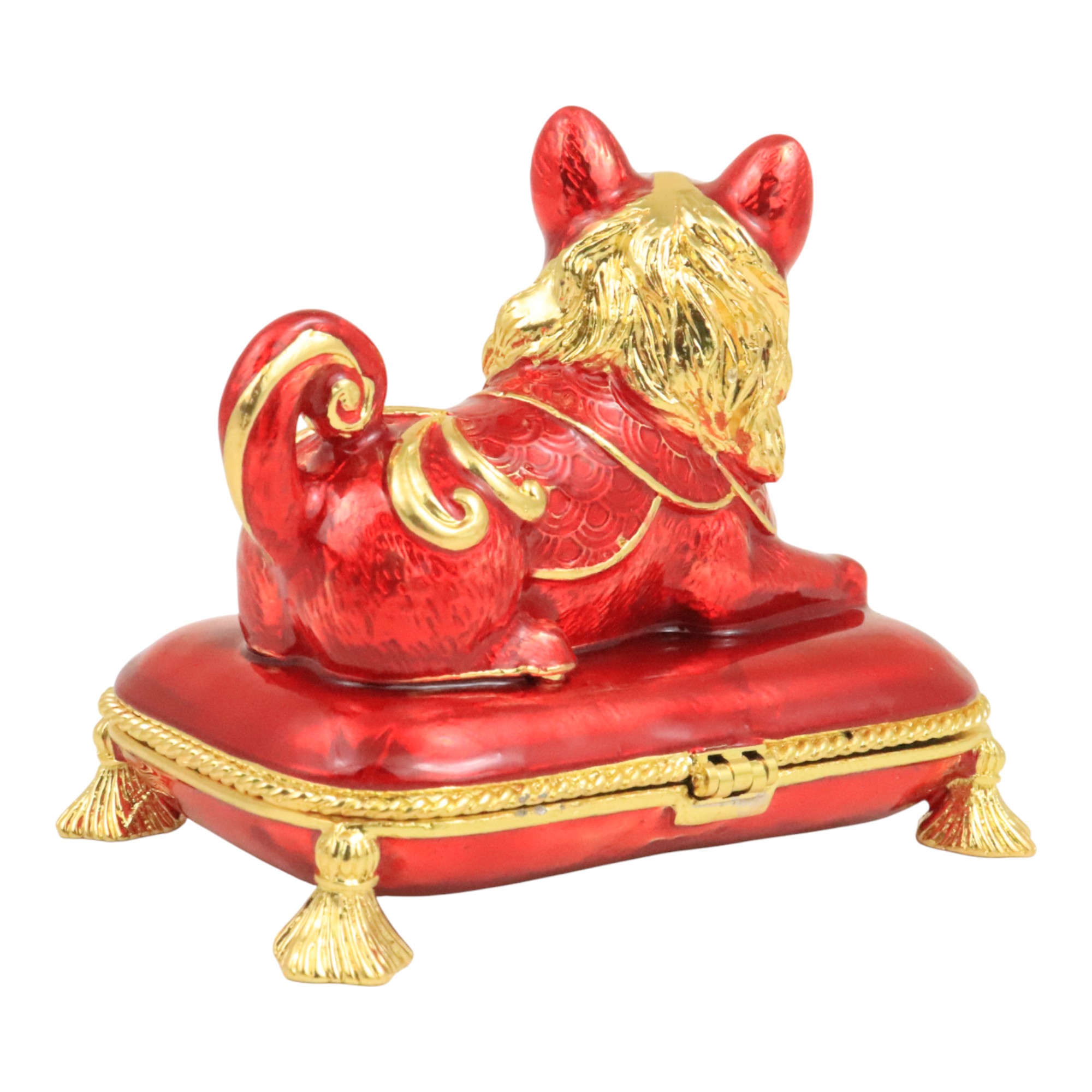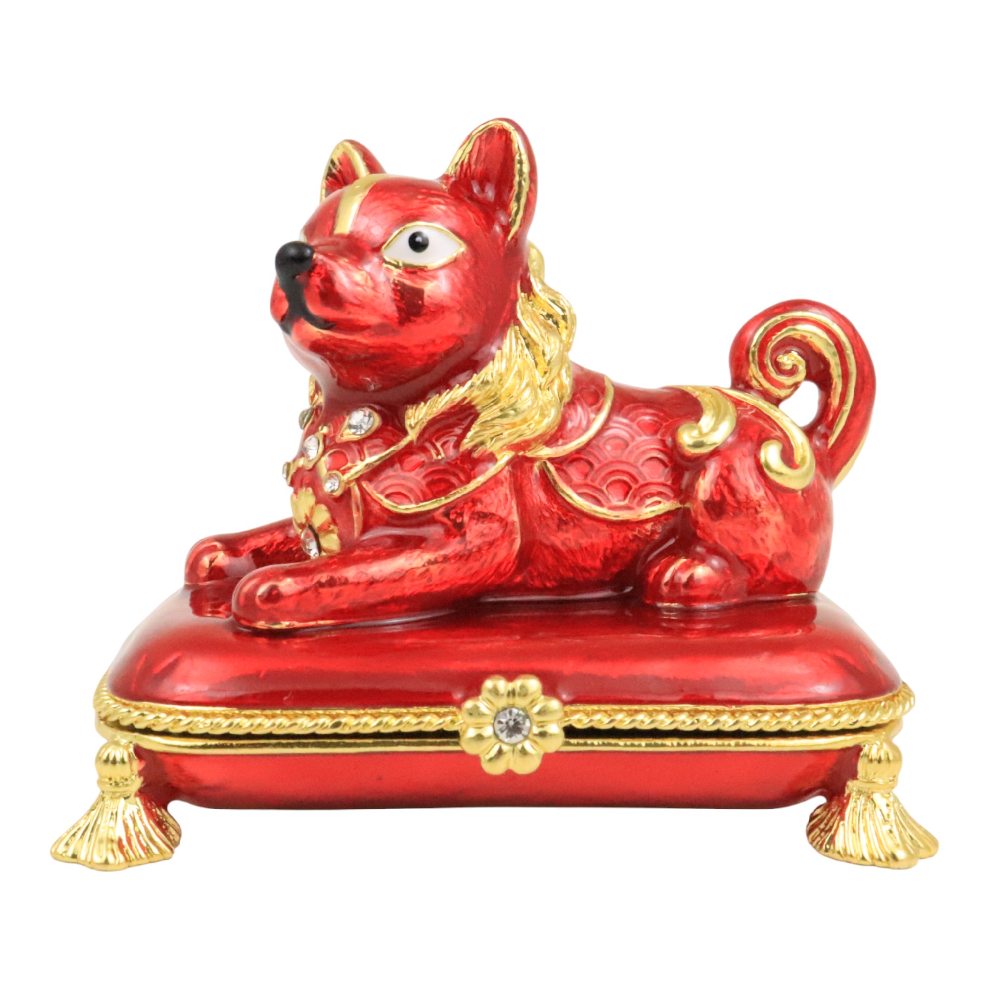 Sitting on a Treasure Pillow, which opens to reveal a hidden mantra for happiness and prosperity, this Treasure Dog stands for bringing wealth and locking it from loss.