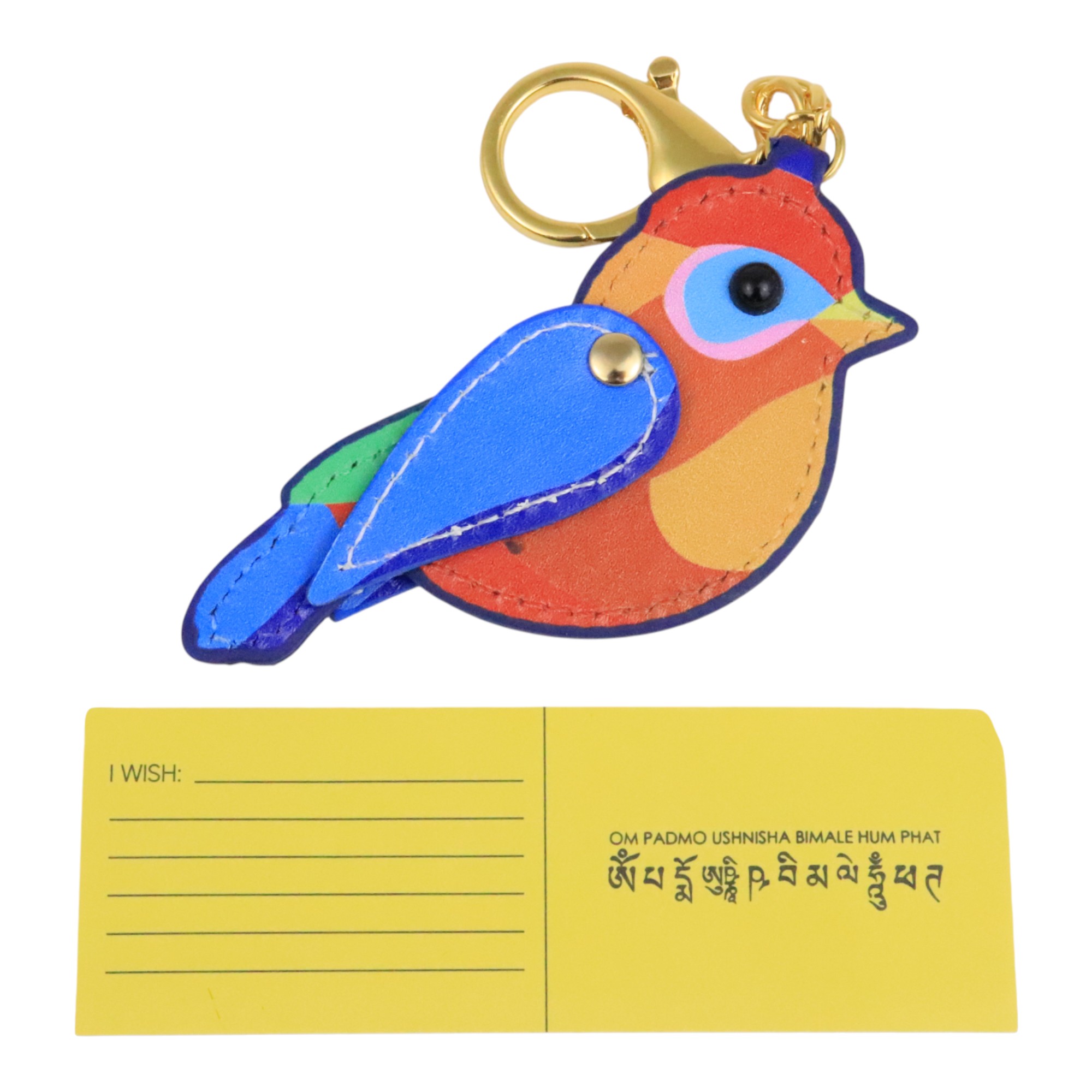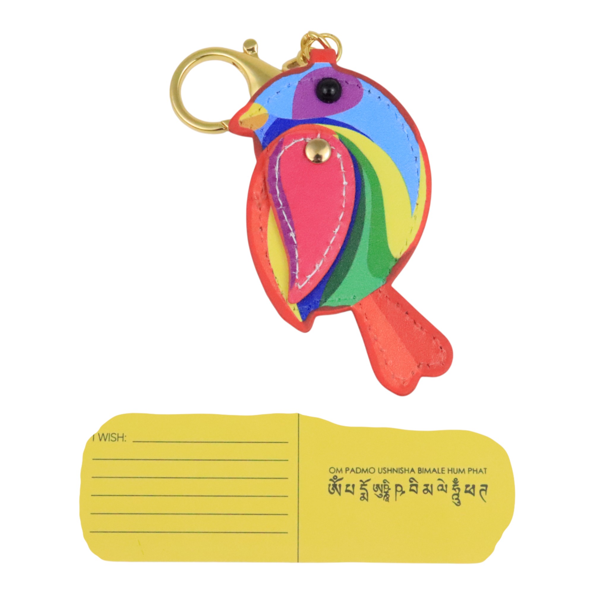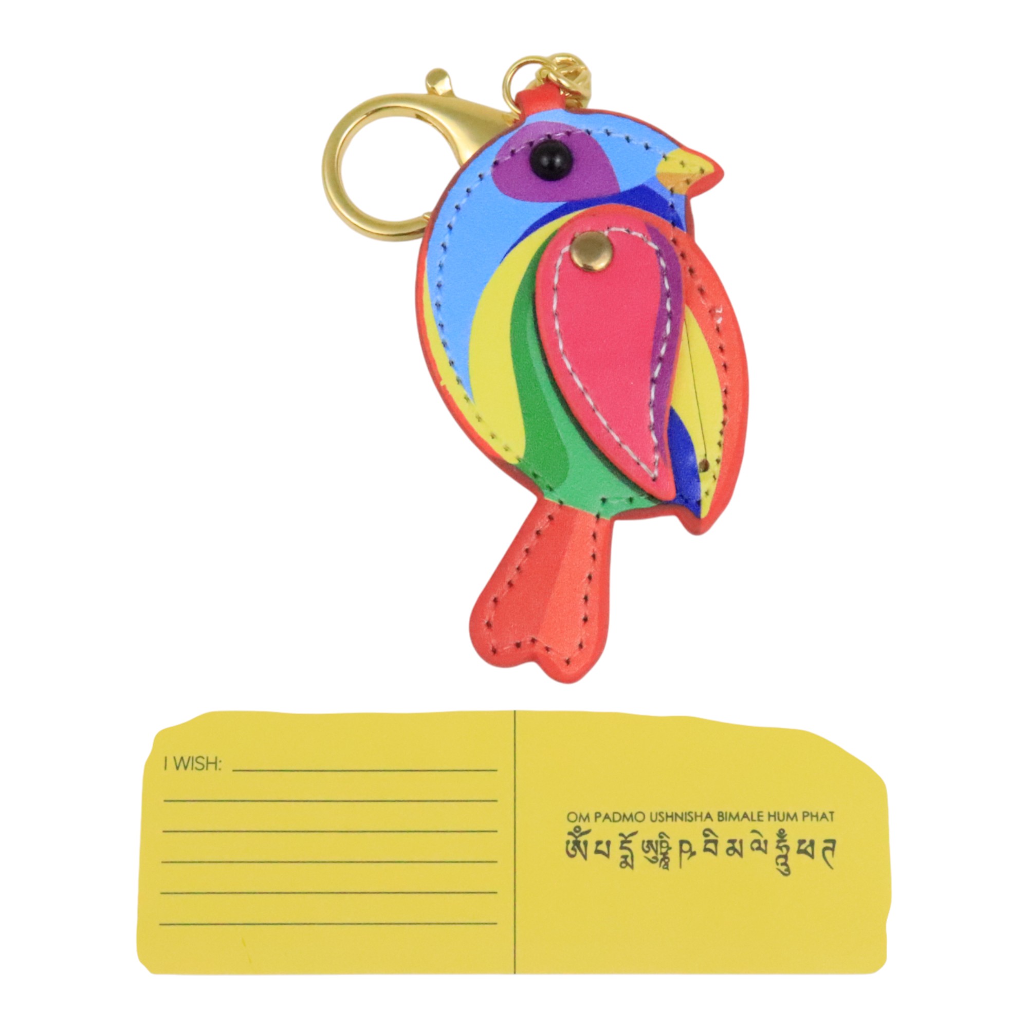 The dimension of the Wish Fulfilling Bird Bag keychain is approx. 2" x 0.25" x 6" . It is made of PU.